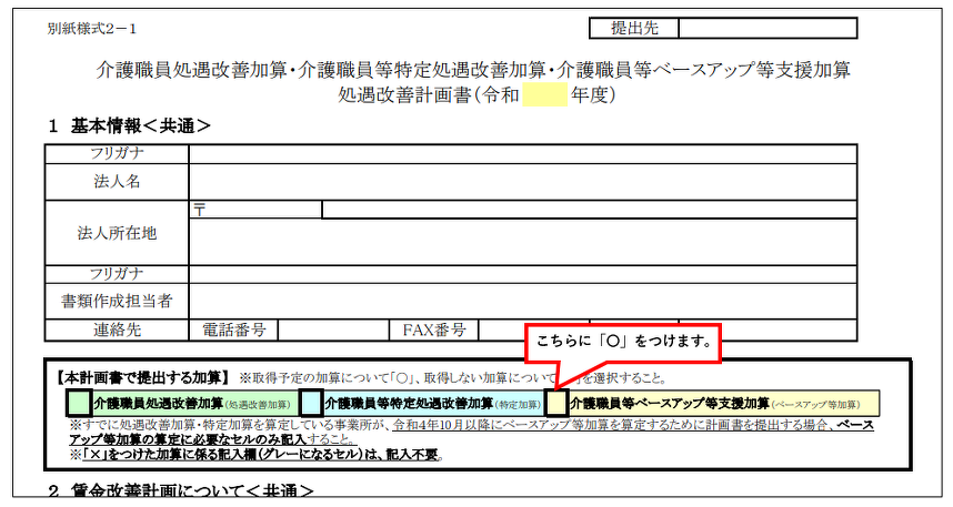 (既に令和4年度の処遇改善の計画書を提出している場合は、「介護職員等ベースアップ等支援加算」にチェックを入れて提出になります。)